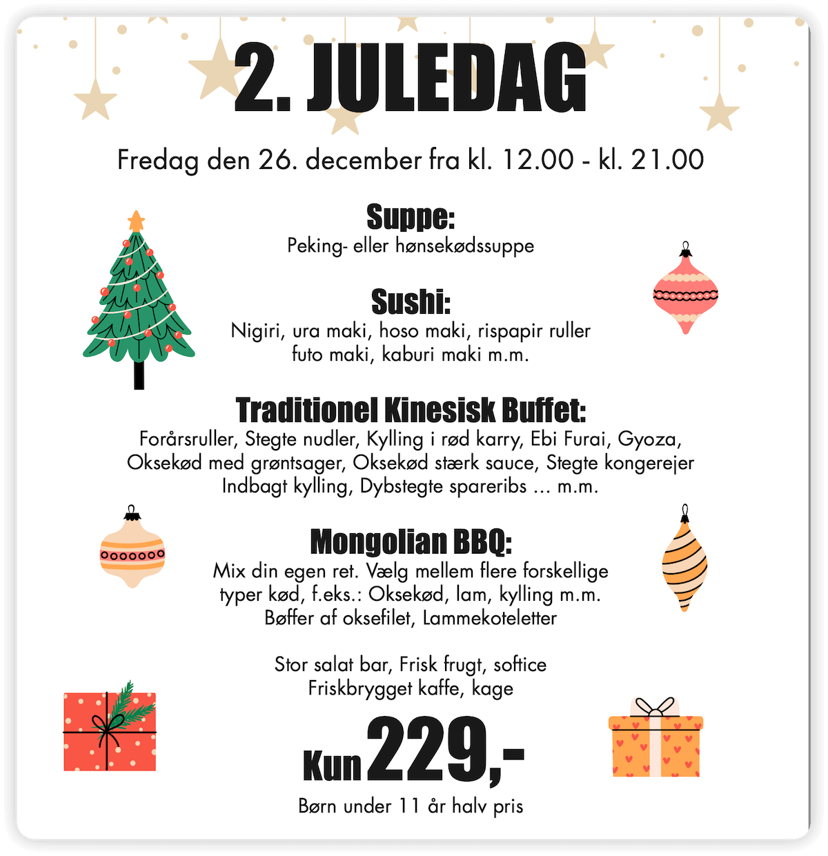 Tirsdag: lukker Mandag - Søndag: Fra kl.15:00 til kl.21:30 Buffet: Fra kl.16:30 til kl.21:00